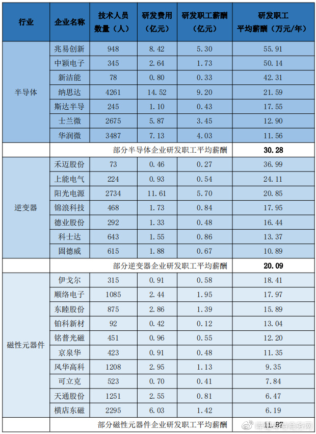 半导体、逆变器、电感、变压器企业研发人员平均薪资对比