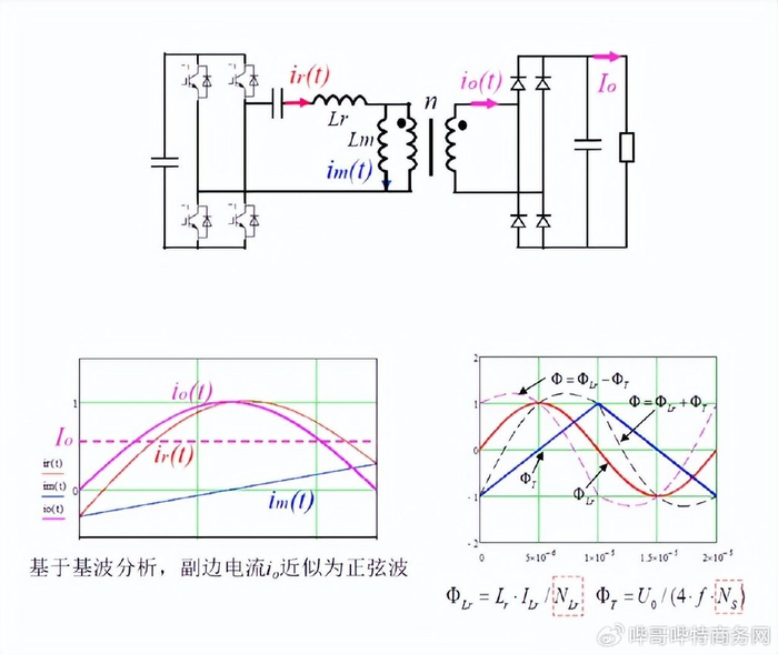 以下图的LLC拓扑为例,在基波分析时,可以认为副边电流(IO)近似为一个正弦波。变压器的励磁电感受副边电压的激励,因此其励磁电流可以看作是一个滞后90度的三角波。