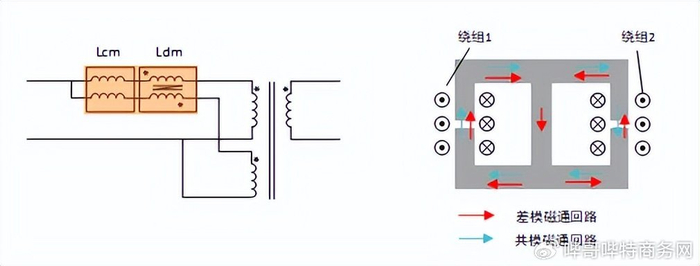 另一种是差模与共模集成。在设计大功率电感、变压器时,通常会采用并联绕组方案。然而,如果结构不对称,会导致并联绕组之间出现不均流现象。为抑制这种不均流,需要增加一个差模电感。