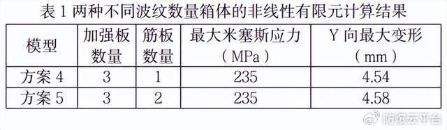 (一)隔爆箱体结构优化针对箱体的强度以及刚度,隔爆箱体进行有限元分析,结果表明:隔爆箱体上不同位置的应力分布不同, 存在局部应力比较高的情况。位于波纹板上的应力最大, 其次为底架筋板上的应力,其他位置的应力相对比较小。由于箱体波纹板上的应力比较大,导致其变形程度相应也比较大,波纹板的厚度、结构型式以及波纹板中的筋板数量这三个因素是导致箱体变形的主要原因。我们针对箱体应力最大、变形最大的波纹板进行分析,提高波纹板的刚度与强度。