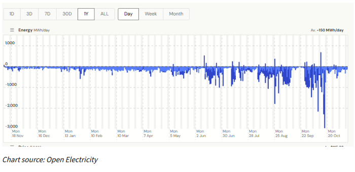 在10月中旬进行全输出测试后,Waratah电池的能源活动显著减少。10月17日星期五,充电和放电活动合计达到峰值2,774MWh。然而,该站点仍保持部分活跃状态,据推测是通过剩余的一台未受影响的高压变压器。