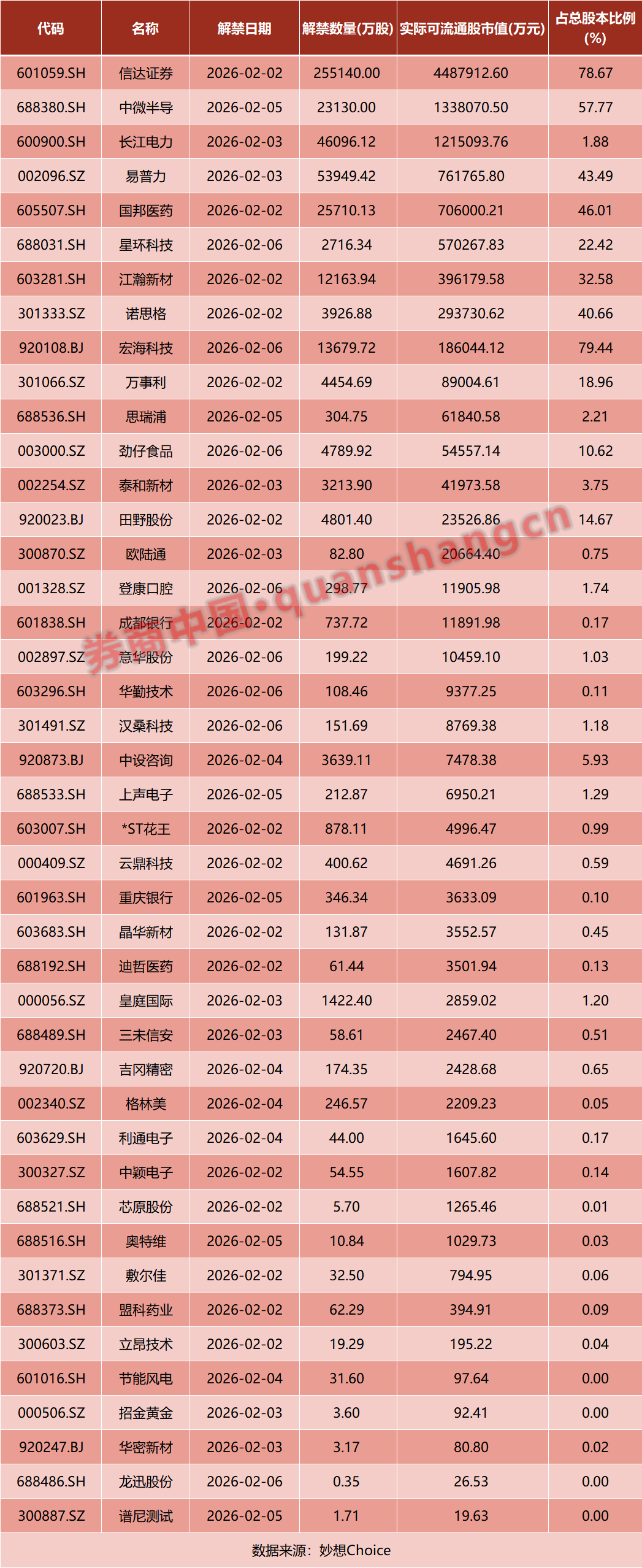 从解禁市值来看,解禁市值居前三位的是:信达证券(448.79亿元)、中微半导(133.81亿元)、长江电力(121.51亿元)。
